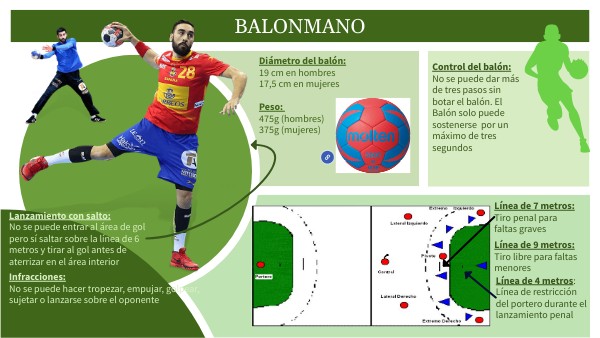 Diámetro del balón: 19 cm en hombres 17,5 cm en mujeres Peso: 475g (hombres) 375g (mujeres)