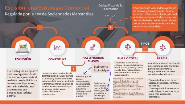 Un acto jurídico que implica la desintegración de una empresa o sociedad y eventualmente la extinción de la misma, mediante la transmisión total o parcial de los elementos que constituyen su activo y pasivo a otras sociedades nuevas preexistentes