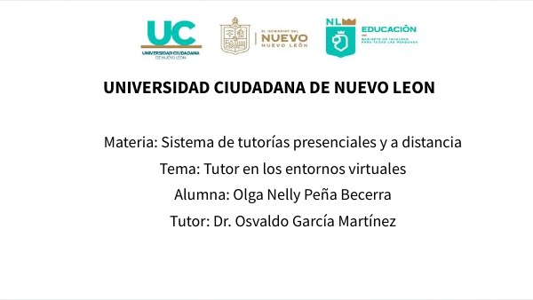 Materia: Sistema de tutorías presenciales y a distancia Tema: Tutor en los entornos virtuales Alumna: Olga Nelly Peña Becerra Tutor: Dr. Osvaldo García Martínez