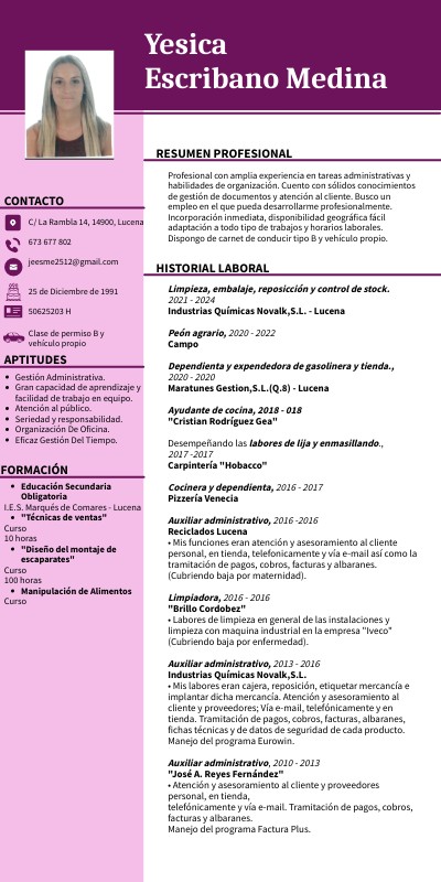 Limpieza, embalaje, reposicción y control de stock. 2021 - 2024 Industrias Químicas Novalk,S.L. - Lucena Peón agrario, 2020 - 2022 Campo Dependienta y expendedora de gasolinera y tienda., 2020 - 2020 Maratunes Gestion,S.L.(Q.8) - Lucena Ayudante de cocina, 2018 - 018 "Cristian Rodríguez Gea" Desempeñando las labores de lija y enmasillando., 2017 -2017 Carpintería "Hobacco" Cocinera y dependienta, 2016 - 2017 Pizzería Venecia Auxiliar administrativo, 2016 -2016 Reciclados Lucena • Mis funciones eran atención y asesoramiento al cliente personal, en tienda, telefonicamente y vía e-mail así como la tramitación de pagos, cobros, facturas y albaranes.(Cubriendo baja por maternidad). Limpiadora, 2016 - 2016 "Brillo Cordobez" • Labores de limpieza en general de las instalaciones y limpieza con maquina industrial en la empresa "Iveco" (Cubriendo baja por enfermedad). Auxiliar administrativo, 2013 - 2016 Industrias Químicas Novalk,S.L. • Mis labores eran cajera, reposición, etiquetar mercancía e implantar dicha mercancía. Atención y asesoramiento al cliente y proveedores; Vía e-mail, telefónicamente y en tienda. Tramitación de pagos, cobros, facturas, albaranes, fichas técnicas y de datos de seguridad de cada producto. Manejo del programa Eurowin. Auxiliar administrativo, 2010 - 2013 "José A. Reyes Fernández" • Atención y asesoramiento al cliente y proveedores personal, en tienda, telefónicamente y vía e-mail. Tramitación de pagos, cobros, facturas y albaranes. Manejo del programa Factura Plus.