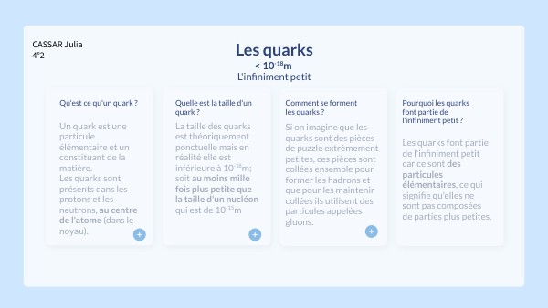 Les quarks font partie de l'infiniment petit car ce sont des particules élémentaires, ce qui signifie qu'elles ne sont pas composées de parties plus petites.