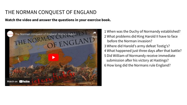 1 When was the Duchy of Normandy established? 2 What problems did King Harold II have to face before the Norman invasion? 3 Where did Harold’s army defeat Tostig’s? 4 What happened just three days after that battle? 5 Did William of Normandy receive immediate submission after his victory at Hastings? 6 How long did the Normans rule England?