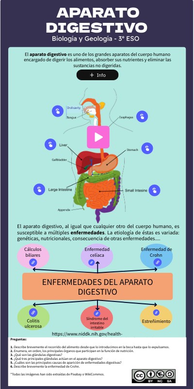 Preguntas: 1. Describe brevemente el recorrido del alimento desde que lo introducimos en la boca hasta que lo expulsamos. 2. Enumera, en orden, los principales órganos que participan en la función de nutrición. 3. ¿Qué son las glándulas digestivas? 4. ¿Qué tres principales glándulas actúan en el aparato digestivo? 5. ¿Cuáles son las principales causas de aparición de enfermedades digestivas? 6. Describe brevemente la enfermedad de Crohn. *Todas las imágenes han sido extraídas de Pixabay o WikiCommos.