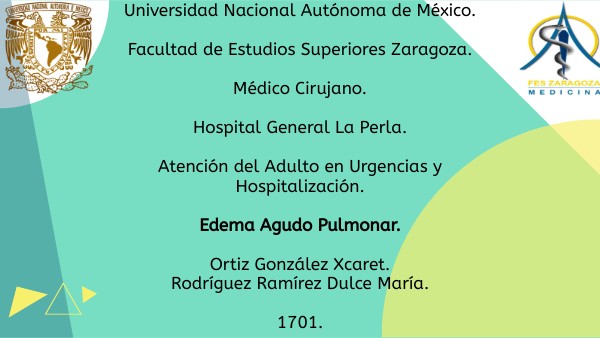 Universidad Nacional Autónoma de México.Facultad de Estudios Superiores Zaragoza. Médico Cirujano. Hospital General La Perla. Atención del Adulto en Urgencias y Hospitalización. Edema Agudo Pulmonar. Ortiz González Xcaret. Rodríguez Ramírez Dulce María. 1701.