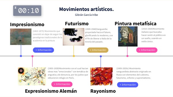 Artlex. (s. f.). Rayonismo vs cubismo: similitudes y diferencias. Artlex. https://www.artlex.com/es/movimientos-artisticos/rayonismo-vs-cubismo/ El impresionismo. (s. f.). https://www.pariscityvision.com/es/giverny/el-impresionismo Lang, C. (2023, 1 junio). Mexican Muralism—The Origins and Revolution of Street Art. Copyright Alliance. https://copyrightalliance.org/mexican-muralism/ Machiste, Y. (2023, 14 junio). IMPRESIONISMO | Definición, características, obras, artistas. MuchaHistoria. https://muchahistoria.com/impresionismo/ Maurizio, P. (2024, 8 enero). ¿Qué es el muralismo mexicano? - características e historia. Enciclopedia de Historia. https://enciclopediadehistoria.com/muralismo-mexicano/ Metaphysical Painting Movement Overview. (s. f.). The Art Story. https://www.theartstory.org/movement/metaphysical-painting/ Wainwright, L. S. (2023, 8 diciembre). Fluxus | Definition, History, Artists, & Facts. Encyclopedia Britannica. https://www.britannica.com/art/Fluxus Nusenovich, M. (2019). Introducción a la historia de las artes: ( ed.). Editorial Brujas. https://elibro.net/en/ereader/cetys/117478?page=264