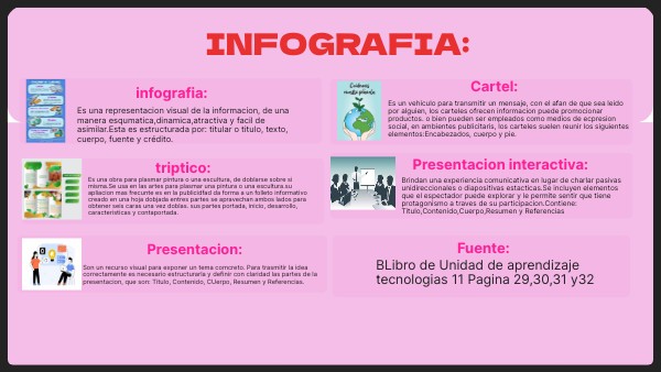 Es una representacion visual de la informacion, de una manera esqumatica,dinamica,atractiva y facil de asimilar.Esta es estructurada por: titular o titulo, texto, cuerpo, fuente y crédito.