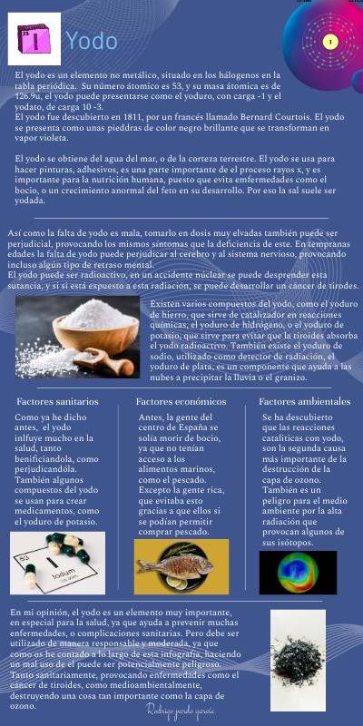 En mi opinión, el yodo es un elemento muy importante, en especial para la salud, ya que ayuda a prevenir muchas enfermedades, o complicaciones sanitarias. Pero debe ser utilizado de manera responsable y moderada, ya que como os he contado a lo largo de esta infografía, haciendo un mal uso de el puede ser potencialmente peligroso. Tanto sanitariamente, provocando enfermedades como el cáncer de tiroides, como medioambientalmente, destruyendo una cosa tan importante como la capa de ozono.