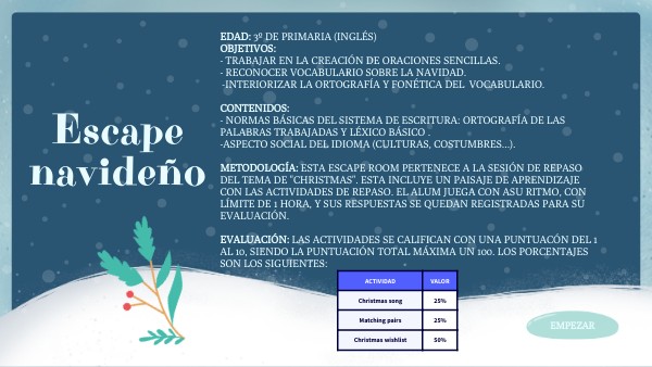 EDAD: 3º DE PRIMARIA (INGLÉS)Objetivos: - Trabajar en LA CREACIÓN DE ORACIONES SENCILLAS. - Reconocer vocabulario sobre LA NAVIDAD. -Interiorizar la ortografía y fonética del vocabulario. contenidos: - Normas básicas del sistema de escritura: ortografía de las palabras trabajadas y léxico básico . -Aspecto social del idioma (culturas, costumbres...). metodología: Esta Escape Room pertenece a la sesión de repaso del tema de "christmas". esta incluye un paisaje de aprendizaje con las actividades de repaso. El alum juega con asu ritmo, con límite de 1 hora, y sus respuestas se quedan registradas para su evaluación. evaluación: las actividades se califican con una puntuacón del 1 al 10, siendo la puntuación total máxima un 100. los porcentajes son los siguientes: