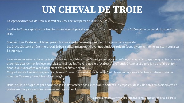 La légende du cheval de Troie a permit aux Grecs de s'emparer de la ville de Troie. La ville de Troie, capitale de la Troade, est assiégée depuis dix ans par les Grecs qui commencent à désespérer un peu de la prendre un jour. Soudain, l'un d'entre eux (Ulysse, paraît-il) a une idée lumineuse qui se traduit de la manière suivante : Les Grecs bâtissent un énorme cheval de bois suffisamment grand pour que plusieurs soldats (dont Ulysse lui-même) puissent se glisser à l'intérieur. Ils amènent ensuite ce cheval près de Troie avec un soldat qui, se faisant passer pour un traître, alors que la troupe grecque lève le camp et semble abandonner le siège, réussit à convaincre les Troyens que le cheval est une offrande à Athéna et que le fait de le faire entrer dans la ville la protègera définitivement des velléités ennemies. Malgré l'avis de Laocoon qui, avec son fameux "timeo Danaos et dona ferentes" est clairement opposé à l'entrée du cheval dans les murs, les Troyens y introduisent l'animal géant. Dans la nuit, alors que les gens dorment, les soldats cachés dans le cheval en sortent et s'emparent de la ville après en avoir ouvert les portes aux troupes grecques revenues subrepticement. Source : https://www.expressio.fr/expressions/un-cheval-de-troie