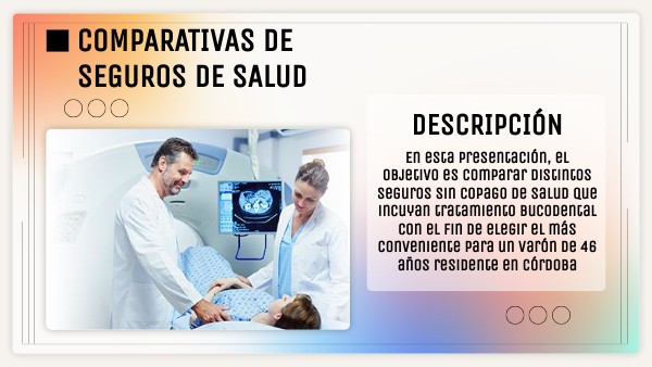 En esta presentación, el objetivo es comparar distintos seguros sin copago de salud que incuyan tratamiento bucodental con el fin de elegir el más conveniente para un varón de 46 años residente en Córdoba