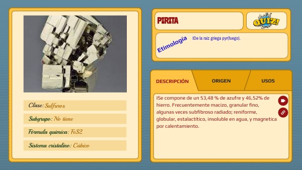 ISe compone de un 53,48 % de azufre y 46,52% de hierro. Frecuentemente macizo, granular fino, algunas veces subfibroso radiado; reniforme, globular, estalactítico, insoluble en agua, y magnetica por calentamiento.