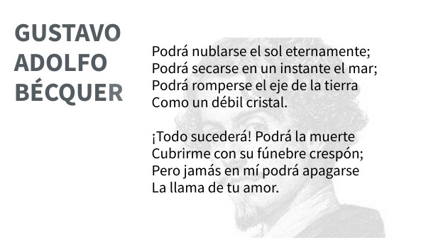 Podrá nublarse el sol eternamente;Podrá secarse en un instante el mar; Podrá romperse el eje de la tierra Como un débil cristal. ¡Todo sucederá! Podrá la muerte Cubrirme con su fúnebre crespón; Pero jamás en mí podrá apagarse La llama de tu amor.