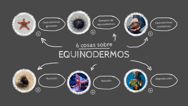 - La mayoría presenta simetría radial. - Tienen aparato ambulacral: una red de tubos por los que circula el agua. - El esqueleto de los equinodermos se denomina dermoesqueleto. En muchos casos, salen de él espinas o púas de diferentes tamaños. El dermoesqueleto crece junto con el animal.