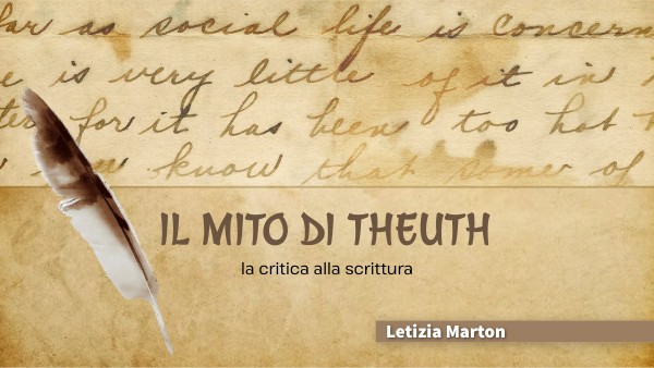Ho scelto di parlare del mito di Theuth perché mi è subito piaciuto: io sono infatti una persona che vuole sempre capire fino in fondo le cose. Studiando però da sola a casa i contenuti di una lezione o leggendo alcune mie annotazioni su uno spartito di pianoforte o su un copione di teatro, ho spesso molti dubbi sul senso da dare ad alcune di esse, nonostante sia stata io stessa a segnarle. Ciò che può apparire ovvio nel contesto della lezione, non lo è più rileggendo gli appunti. Finisco quindi spesso per spendere molto tempo su di essi pur di comprederli, consapevole che molte volte le conclusioni a cui arrivo sono mie interpretazioni che si discostano dalla realtà o da ciò che intendeva l'insegnante. A volte invece, non arrivando a una soluzione, sono costretta a studiare ciò che è scritto senza capirlo.