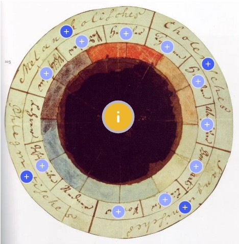 Sí ves bien La Rosa de los Temperamentos, verás que empareja 12 colores con el nombre de las emociones y temperamentos humanos. Y éstos doce, a su vez agrupados en los cuatro temperamentos derivados de la teoría filosófica griega y romana de la antigüedad. Aunque la teoría de Goethe de la psicología del color no es necesariamente aceptada hoy en día por la ciencia moderna, tuvo una gran influencia en la psicología y la filosofía del siglo XIX