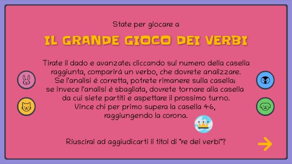 Tirate il dado e avanzate; cliccando sul numero della casella raggiunta, comparirà un verbo, che dovrete analizzare. Se l'analisi è corretta, potrete rimanere sulla casella; se invece l'analisi è sbagliata, dovrete tornare alla casella da cui siete partiti e aspettare il prossimo turno. Vince chi per primo supera la casella 46, raggiungendo la corona. Riuscirai ad aggiudicarti il titol di "re dei verbi"?
