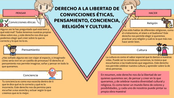 En resumen, este derecho nos da la libertad de ser quienes queremos ser, de pensar y creer en lo que queramos, y de celebrar nuestra diversidad cultural y religiosa. Es como tener un mundo lleno de colores y posibilidades, ¡y cada uno de nosotros puede pintar su propia obra maestra!