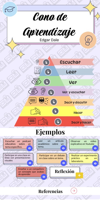 La representación visual del Cono de Aprendizaje de Edgar Dale, destaca la importancia de la participación activa en el aprendizaje. Desde métodos más pasivos, como la escucha y la lectura, hasta niveles más activos, como la enseñanza a otros, el cono subraya la progresión hacia una comprensión más profunda a través de la participación activa. Como docente de telesecundaria, esta perspectiva refuerza la necesidad de diseñar estrategias pedagógicas que fomenten la interacción con la información, especialmente en un entorno virtual, utilizando herramientas multimedia y promoviendo la expresión y discusión de ideas entre los estudiantes. El cono inspira a buscar formas creativas de estimular la participación activa y construir conocimientos de manera significativa.