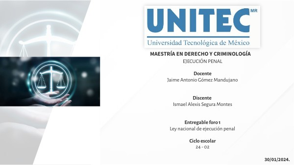 EJECUCIÓN PENAL Docente Jaime Antonio Gómez Mandujano Discente Ismael Alexis Segura Montes Entregable foro 1 Ley nacional de ejecución penal Ciclo escolar 24 - 02