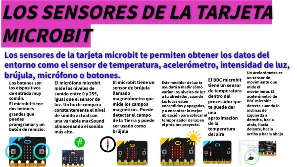 Los sensores de la tarjeta microbit te permiten obtener los datos del entorno como el sensor de temperatura, acelerómetro, intensidad de luz, brújula, micrófono o botones.
