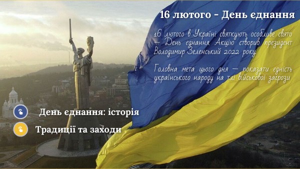 16 лютого в Україні святкують особливе свято — День єднання. Акцію створив президент Володимир Зеленський 2022 року. Головна мета цього дня — показати єдність українського народу на тлі військової загрози