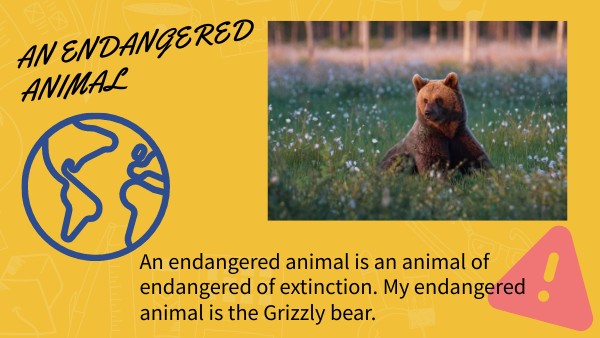An endangered animal is an animal of endangered of extinction. My endangered animal is the Grizzly bear.