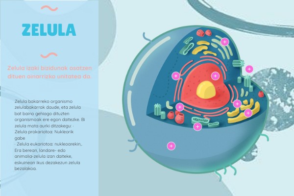 Zelula bakarreko organismo zelulabakarrak daude, eta zelula bat baino gehiago dituzten organismoak ere egon daitezke. Bi zelula mota aurki ditzakegu: · Zelula prokariotoa: Nukleorik gabe· Zelula eukariotoa: nukleoarekin,. Era berean, landare- edo animalia-zelula izan daiteke, eskuinean ikus dezakezun zelula bezalakoa.
