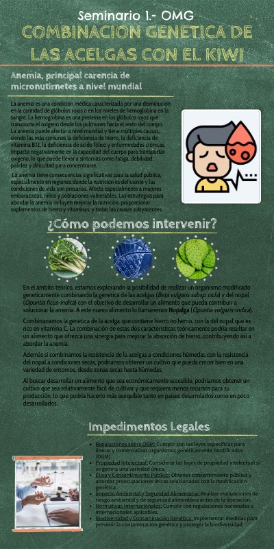 En el ámbito teórico, estamos explorando la posibilidad de realizar un organismo modificado geneticamente combinando la genetica de las acelgas (Beta vulgaris subsp. cicla) y del nopal (Opuntia ficus-indica) con el objetivo de desarrollar un alimento que pueda contribuir a solucionar la anemia. A este nuevo alimento lo llamaremos Nopalga (Opuntia vulgaris-indica).Combinariamos la genetica de la acelga que contiene hierro no hemo, con la del nopal que es rico en vitamina C. La combinación de estas dos características teóricamente podría resultar en un alimento que ofrezca una sinergia para mejorar la absorción de hierro, contribuyendo así a abordar la anemia. Además si combinamos la resistencia de la acelgas a condiciones húmedas con la resistencia del nopal a condiciones secas, podriamos obtener un cultivo que pueda crecer bien en una variedad de entornos, desde zonas secas hasta húmedas. Al buscar desarrollar un alimento que sea económicamente accesible, podriamos obtener un cultivo que sea relativamente fácil de cultivar y que requiera menos recursos para su producción, lo que podría hacerlo más asequible tanto en países desarrolados como en poco desarrollados.
