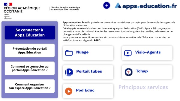 Apps.education.fr est la plateforme de services numériques partagés pour l'ensemble des agents de l'Éducation nationale. Développée au sein de la direction du numérique pour l'éducation (DNE), Apps a été conçue pour permettre un accès national à toutes les ressources, tout au long de votre carrière, même en cas de changement d’académie. Vous y trouverez les outils essentiels et communs à tous les métiers de l’Éducation nationale, qui satisfont tous aux règles du RGPD.