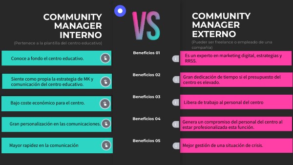 Al formar parte de la plantilla, es una opción de menonr coste para el centro, lo que supone un gran ahorro en el presupuesto. Al profesor se le suele asignar un par de horas a la semana para llevar a cabo las funciones de community manager.