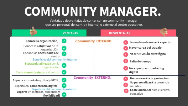 Ventajas y desventajas de contar con un community manager que sea personal del centro ( interno) o externo al centro educativo.