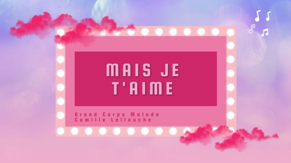 ."Mais je t'aime" de Grand corps malade et Camille Lellouche est sortie le 10 juin 2020..Le style musical est le slam et la pop..L'aspect de l'amour qui est mis en valeur est l'amour mutuel dans le couple malgré les obstacles de la vie. .Dans la chanson on peut sentir la puissance de leur amour malgré les hauts et les bas et malgré les difficultés ils ne peuvent pas se passer l'un de l'autre. .La vision de l'amour est sincère mais poignante avec ses différentes facettes