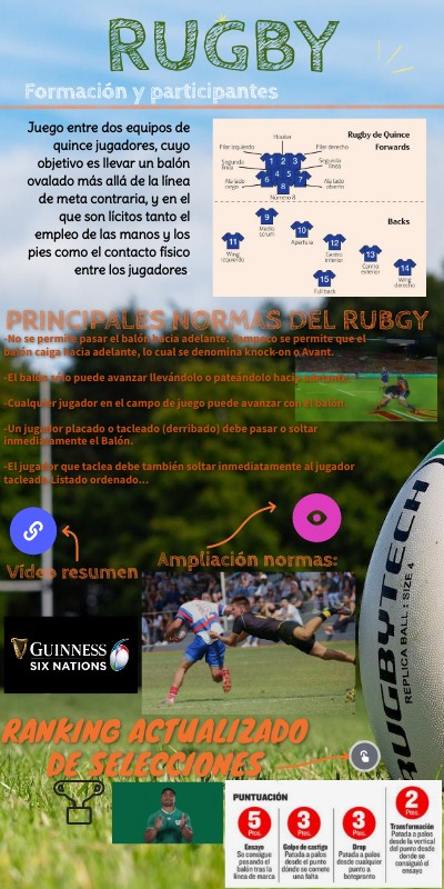 Juego entre dos equipos de quince jugadores, cuyo objetivo es llevar un balón ovalado más allá de la línea de meta contraria, y en el que son lícitos tanto el empleo de las manos y los pies como el contacto físico entre los jugadores.