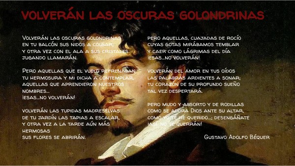 Volverán las oscuras golondrinas en tu balcón sus nidos a colgar, y otra vez con el ala a sus cristales jugando llamarán. Pero aquellas que el vuelo refrenaban tu hermosura y mi dicha a contemplar, aquellas que aprendieron nuestros nombres... ¡esas...no volverán! volverán las tupidas madreselvas de tu jardín las tapias a escalar, y otra vez a la tarde aún más hermosas sus flores se abrirán.