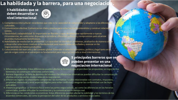 - Conocimiento del mercado y del contexto global: Entender el entorno economico, politico y legal tanto en el pais de origen como en el extranjero es fundamental para negociar con exito a nivel internacional.