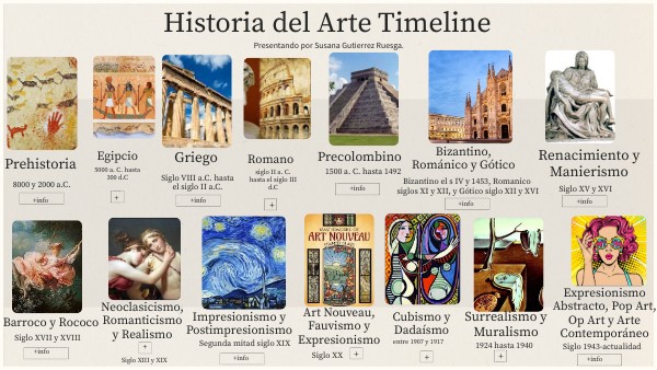 Arte Rupestre, Paleolitico , Neolitico Durante la prehistoria, las primeras formas de arte humano se manifestaron en pinturas rupestres y grabados en cuevas. Los artistas prehistóricos crearon obras utilizando pigmentos naturales y técnicas de grabado, representando animales, personas y escenas de caza y recolección en una variedad de estilos y técnicas. Estas obras de arte prehistóricas son importantes porque muestran la capacidad temprana del ser humano para la creatividad y la expresión artística.