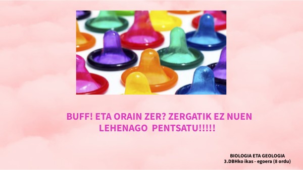 -Egoera konplexu eta esanguratsuen aurrean jarriko ditugu ikasleak, konpetentzia anitzak aktibatuz eta ikaskuntza berriak garatuz, egoerari erantzuna, irtenbidea emateko. TESTUINGURUA: Gaur egun 3DBH-ko ikasleek Sexualitate eta genero-indarkeriaren inguruko ikastaroak izan dituzte. Suposatzen da nahiko ondo ezagutzen dituztela antisorgailu motak eta nola erabil daitezken. Baina pasiloetan eta klasean entzuten denak ez du hori egiaztatzen. ABIAPUNTUA: 3.DBH-n dauden ikasleak beraien lehenengo harreman sexualak izaten hasten dira. Hori dela eta, zer nolako ondorioak izan ditzakete jakinean gainean egon behar dira. Hedabideetan agertzen denez gero eta nerabe gehiago haurdun gelditzen dira eta ez bakarrik hori, sexu bidez transmititutako gaixotasunaren ehunekoa gora doa. Hau ekiditeko metodo antikontzeptiboei buruzko informazioa ezinbestekoa da. AZKEN EKOIZPENA: Infografia bat metodo antikontzeptibo motak azaltzen duena.