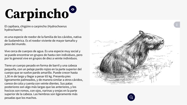 El capibara, chigüire o carpincho (Hydrochoerus hydrochaeris) es una especie de roedor de la familia de los cávidos, nativa de Sudamérica. Es el roedor viviente de mayor tamaño y peso del mundo. Vive cerca de cuerpos de agua. Es una especie muy social y se puede encontrar en grupos de hasta cien individuos, pero por lo general vive en grupos de diez a veinte individuos. Tiene un cuerpo pesado en forma de barril y una cabeza pequeña, con un pelaje pardo rojizo en la parte superior del cuerpo que se vuelve pardo amarillo. Puede crecer hasta 1,30 m de largo y llegar a pesar 65 kg. Presenta pies ligeramente palmeados, y de manera similar a otros cávidos, carece de cola y cuenta con veinte dientes. Sus patas posteriores son algo más largas que las anteriores, y los hocicos son romos, con ojos, narinas y orejas en la parte superior de la cabeza. Las hembras son ligeramente más pesadas que los machos.