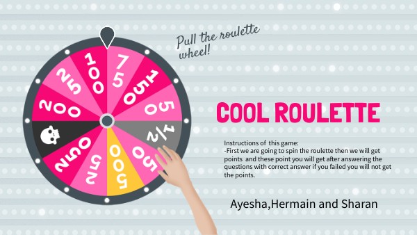 Instructions of this game: -First we are going to spin the roulette then we will get points and these point you will get after answering the questions with correct answer if you failed you will not get the points.