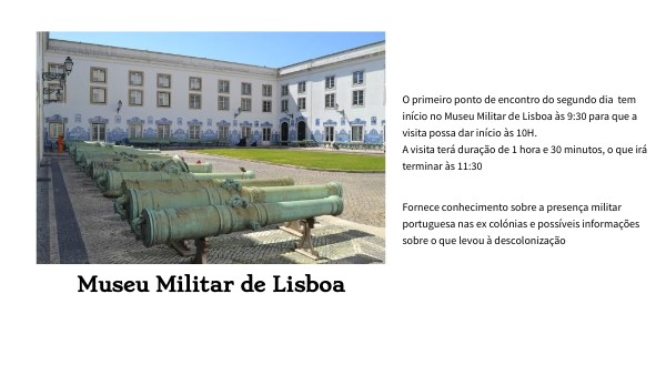 O primeiro ponto de encontro do segundo dia tem início no Museu Militar de Lisboa às 9:30 para que a visita possa dar início às 10H. A visita terá duração de 1 hora e 30 minutos, o que irá terminar às 11:30