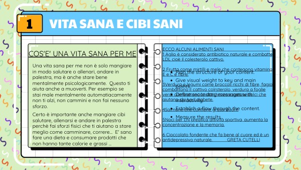 ECCO ALCUNI ALIMENTI SANI 1 Aglio è considerato antibiotico naturale e combatte LDL cioè il colesterolo cattivo. 2 Frutta come mirtilli e mele che contegono vitamina E e C e fibre. . 3Verdura e legumi come broccoli ricchi di fibre, fagioli combattono il cattivo colrsterolo, verdura a foglie verdi combattono la stitichezza e patate dolci che aiutano chi ha il diabete. 4Salmone che contiene grassi buoni. 5Noci per chi preatica attività sportiva, aumenta la concentrazione e la memoria. 6 Cioccolato fondente che fa bene al cuore ed è un antidepressivo naturale. GRETA CUTELLI