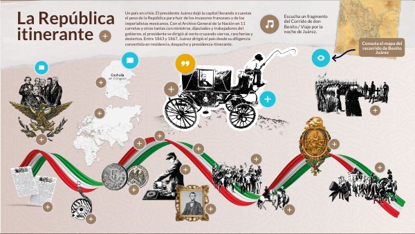 Un país en crisis. El presidente Juárez dejó la capital llevando a cuestas el peso de la República para huir de los invasores franceses y de los imperialistas mexicanos. Con el Archivo General de la Nación en 11 carretas y otras tantas con ministros, diputados y trabajadores del gobierno, el presidente se dirigió al norte cruzando sierras, rancherías y desiertos. Entre 1863 y 1867, Juárez dirigió el país desde su diligencia convertida en residencia, despacho y presidencia itinerante.
