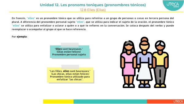 En francés, "elles" es un pronombre tónico que se utiliza para referirse a un grupo de personas o cosas en tercera persona del plural. A diferencia del pronombre personal sujeto "elles", que se utiliza para indicar el sujeto de la oración, el pronombre tónico "elles" se utiliza para enfatizar o aclarar a quién o a qué te refieres en la conversación. Se coloca después del verbo y puede reemplazar o acompañar al grupo al que se hace referencia.
