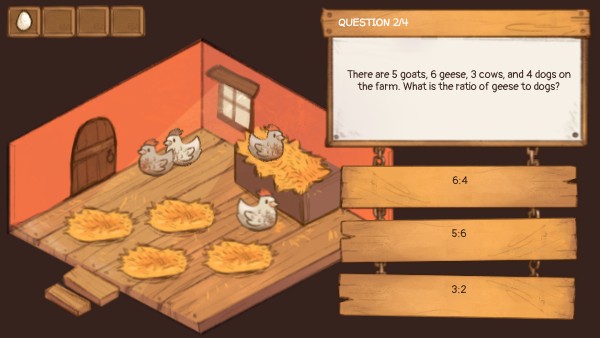 There are 5 goats, 6 geese, 3 cows, and 4 dogs on the farm. What is the ratio of geese to dogs?