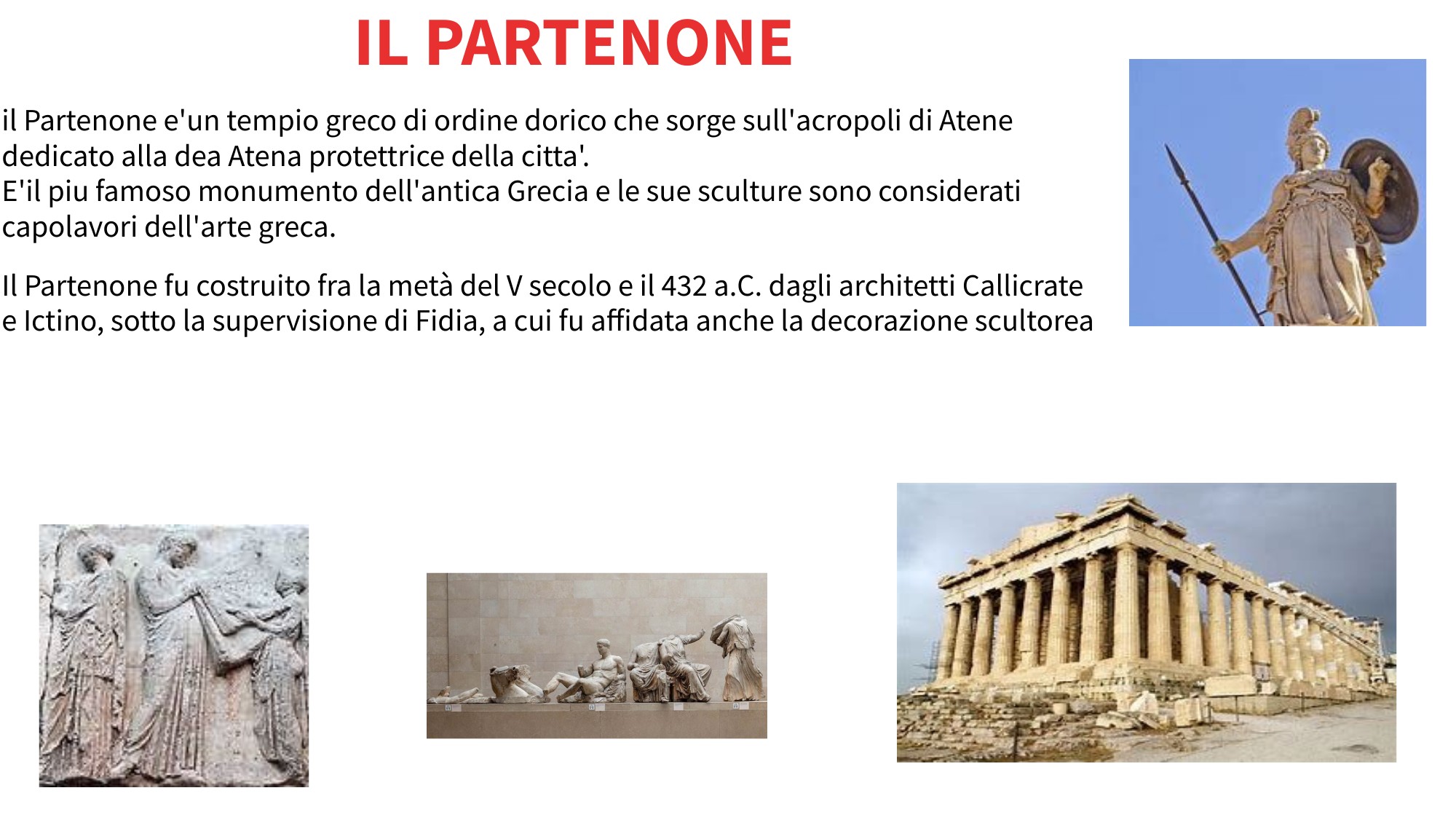 il Partenone e'un tempio greco di ordine dorico che sorge sull'acropoli di Atene dedicato alla dea Atena protettrice della citta'. E'il piu famoso monumento dell'antica Grecia e le sue sculture sono considerati capolavori dell'arte greca.