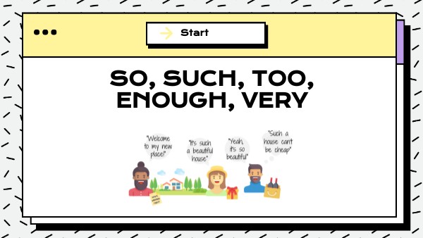 1. I didn’t like the book. The story was __SO/VERY/REALLY/QUITE__ stupid. 2. The weather is beautiful, isn’t it? I didn’t expect it to be __SUCH A__ nice day. 3. Some of us had to sit on the floor because there weren’t _ENOUGH__ chairs. 4. The wallet was __TOO__ big to put in my pocket.
