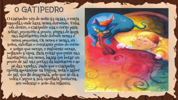 O Gatipedro vén de noite ás casas, e entra naquelas onde haxa nenos durmindo. Unha vez dentro, o Gatipedro usa o corno para soltar, pouquiño a pouco, pingas de auga nas habitacións onde dormen nenas e nenos pequenos. Os nenos e nenas, en soños, escoitan o constante goteo do corno e soñan que mexan, e realmente mexan, mollando a cama. Para evitar que entre nas habitacións dos nenos, basta con botar un pouco de sal nas portas da habitación e ao pé das xanelas. Dado que o Gatipedro camiña apoiándose na lingua, nota o sabor do sal, que lle desagrada, polo que se dá a volta e segue a súa camiñada nocturna, sen molestar o soño dos infantes.