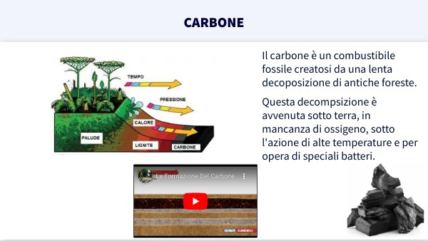 Esistono 4 tipi di carbone: - Torbe: sono i carboni più giovani nei quali il processo di fossilizzazione non è ancora completato; dunque, il loro potere calorifero è basso -Ligniti: sono carboni fossili giovani, utilizzati per estrarre gas, ammoniaca, petrolio sintetico etc... -Litantraci: sono carboni fossili molto antichi, impiegati come combustibili o per ottenere il coke metallurgico -Antraciti: sono i carboni più antichi, dotati del più alto potere calorifero.