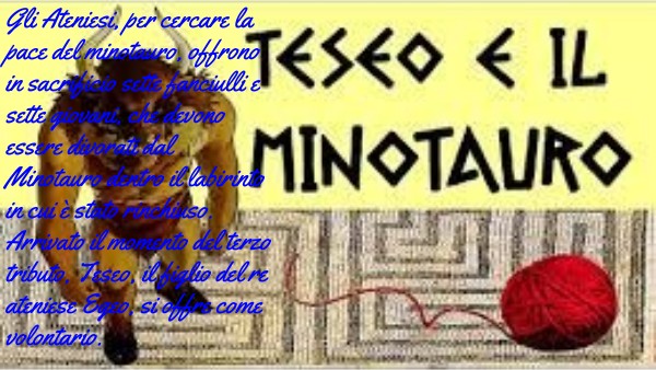 Gli Ateniesi, per cercare la pace del minotauro, offrono in sacrificio sette fanciulli e sette giovani, che devono essere divorati dal Minotauro dentro il labirinto in cui è stato rinchiuso.Arrivato il momento del terzo tributo, Teseo, il figlio del re ateniese Egeo, si offre come volontario.