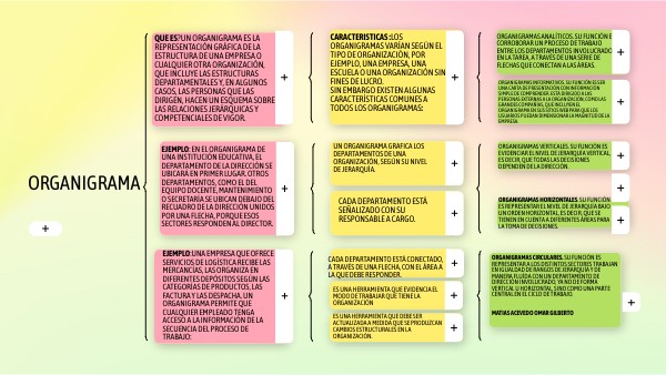 Organigramas circulares. Su función es representar a los distintos sectores trabajan en igualdad de rangos de jerarquía y de manera fluída con un departamento de dirección involucrado, ya no de forma vertical u horizontal, sino como una parte central en el ciclo de trabajo. MATIAS ACEVEDO OMAR GILBERTO
